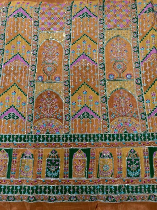 This natural creap pure fabric comes with position print embroidery work is quite durable, even though its luxurious and high-style look would make you think otherwise. It is ideal for weddings and other important occasions.