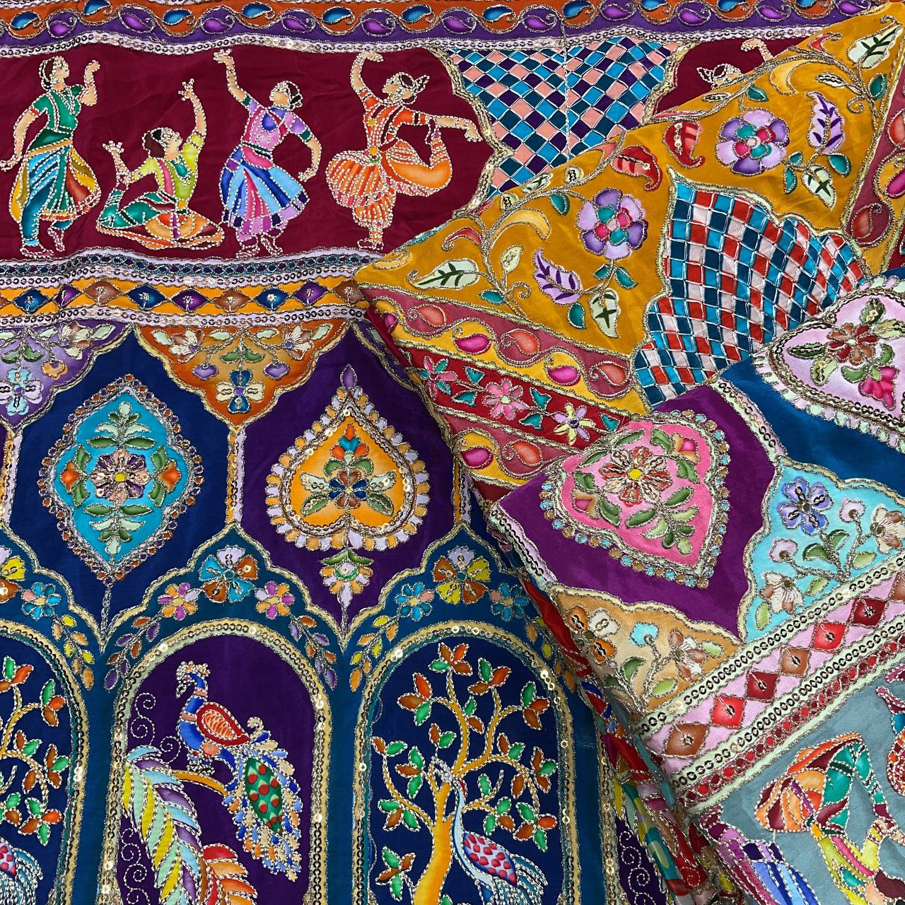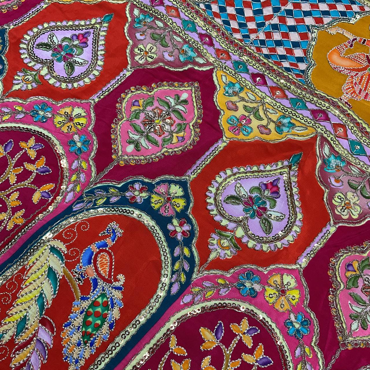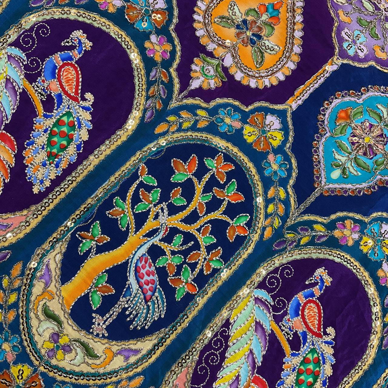 The multi-colored position print is accented with delicate embroidery work and sequins, giving it a rich, hand-crafted feel. Lightweight yet luxurious, this fabric is designed for those who want their outfit to be a conversation piece.