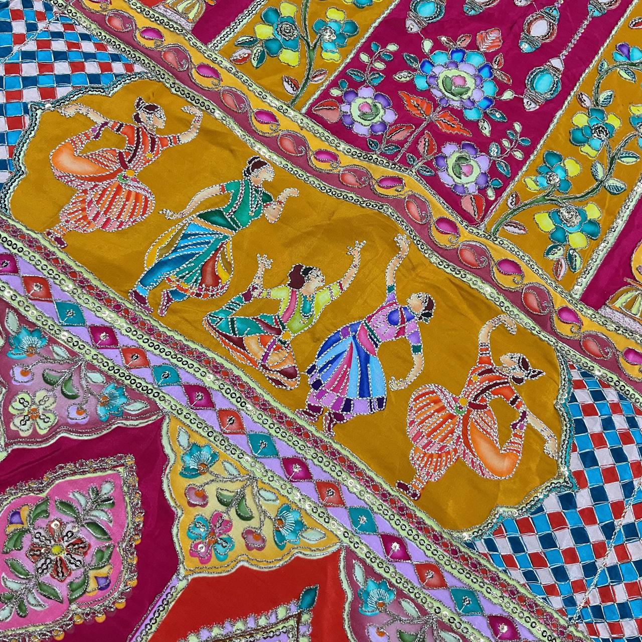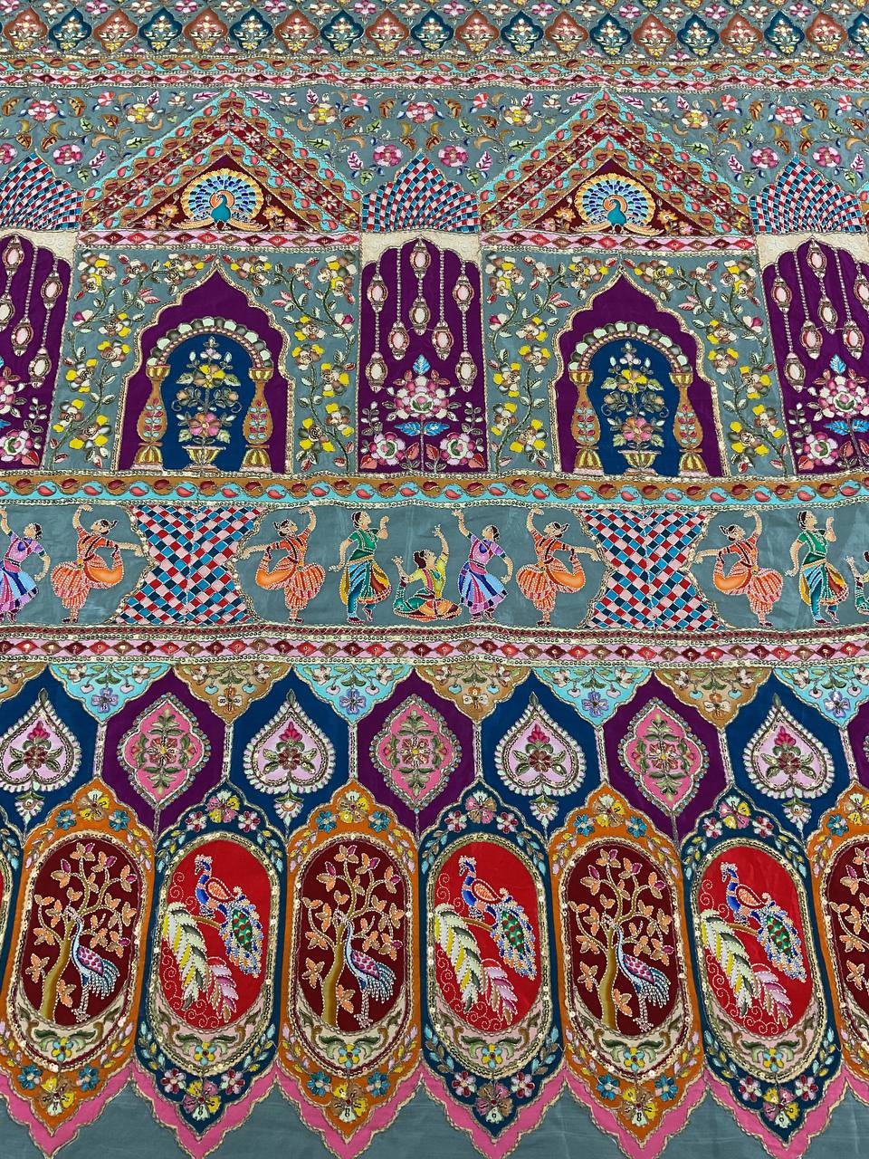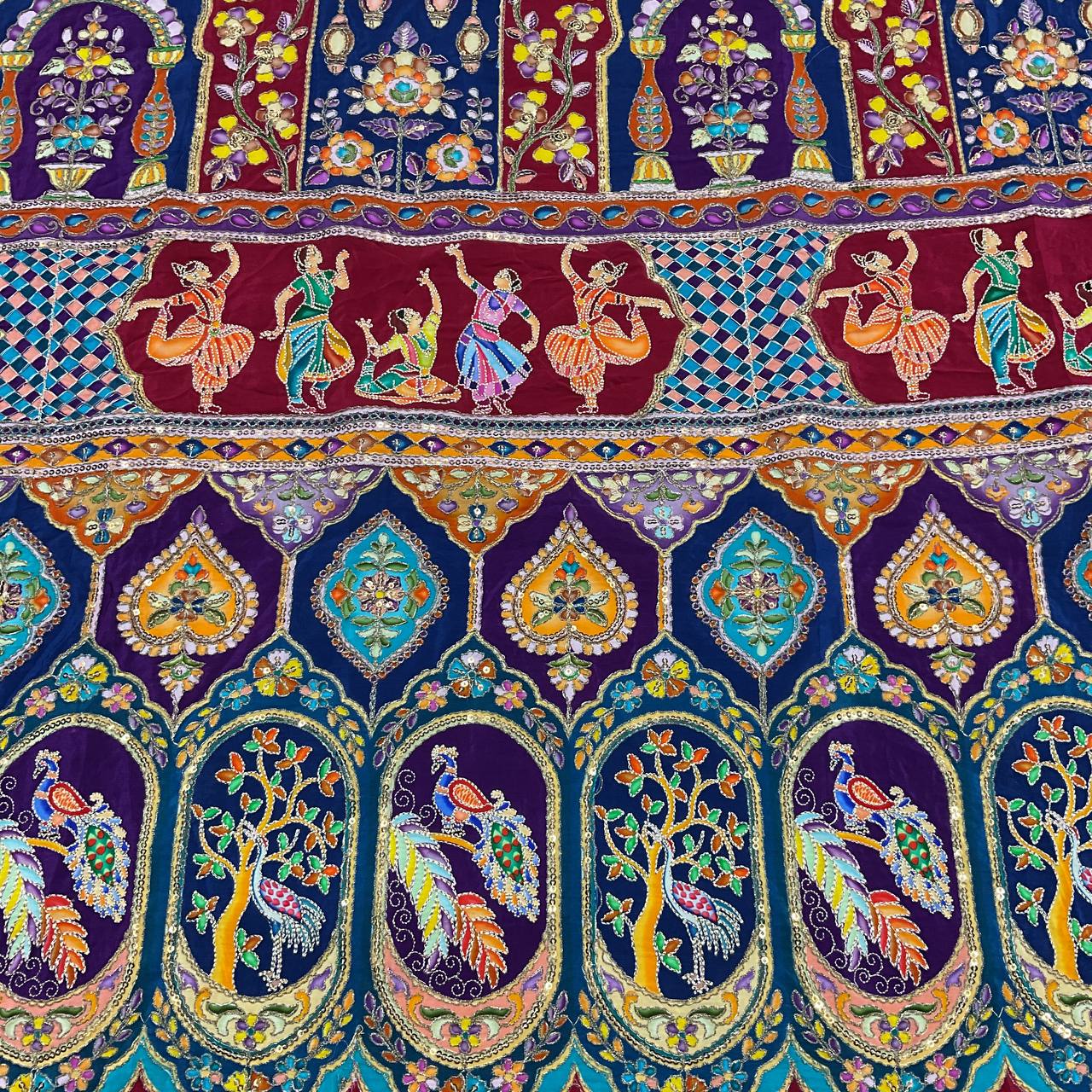 The multi-colored position print is accented with delicate embroidery work and sequins, giving it a rich, hand-crafted feel. Lightweight yet luxurious, this fabric is designed for those who want their outfit to be a conversation piece.