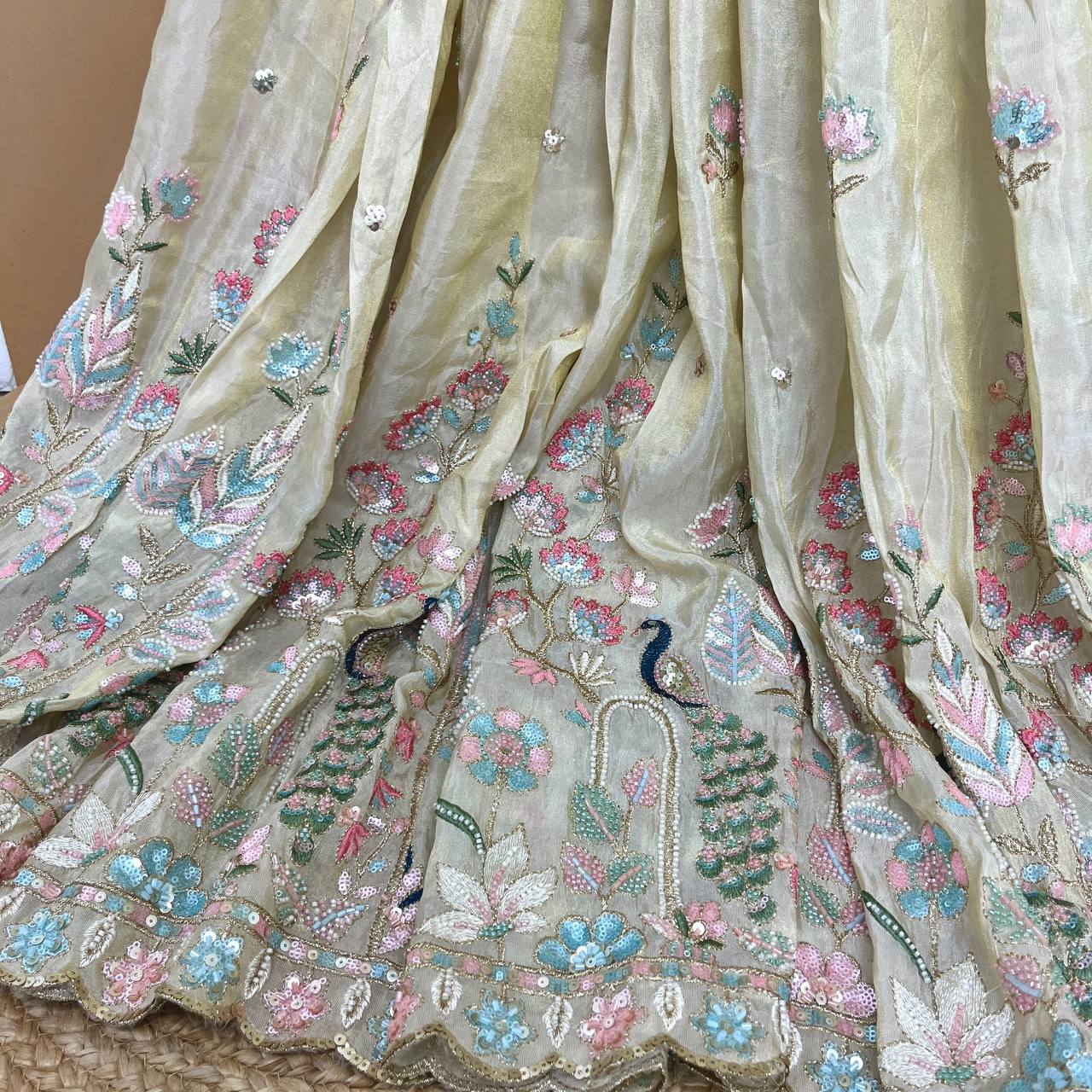 Make a statement effortlessly with this Tissue-Silk Lehenga that blends comfort with fashion-forward style.